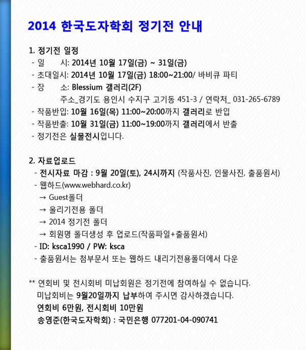 2014 한국도자학회 정기전 일정 페이지 정보 작성자 최고관리자 댓글 0건 조회 1,974회 작성일 20-03-25 14:54 목록 본문 .. 이전글Vol.11 No.2 논문 투고 일정 안내 20.03.25 다음글2014 한국도자학회 중국장춘 여름 학술대회 안내 20.03.25 댓글 0 댓글목록 등록된 댓글이 없습니다.